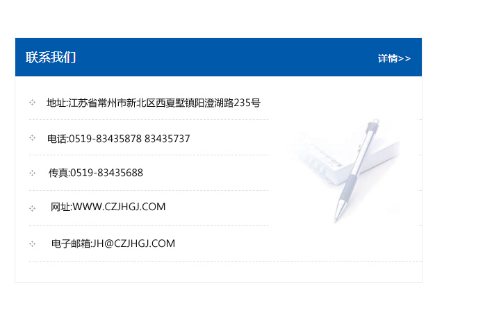 地址:常州市新北區友邦商務大廈1幢16、17層  電話:0519-85101652  傳真:0519-85112595  郵編:213022  網址:www_cz-jiayue_cn.shahua1.com  郵箱:xiajifengaa@163.com